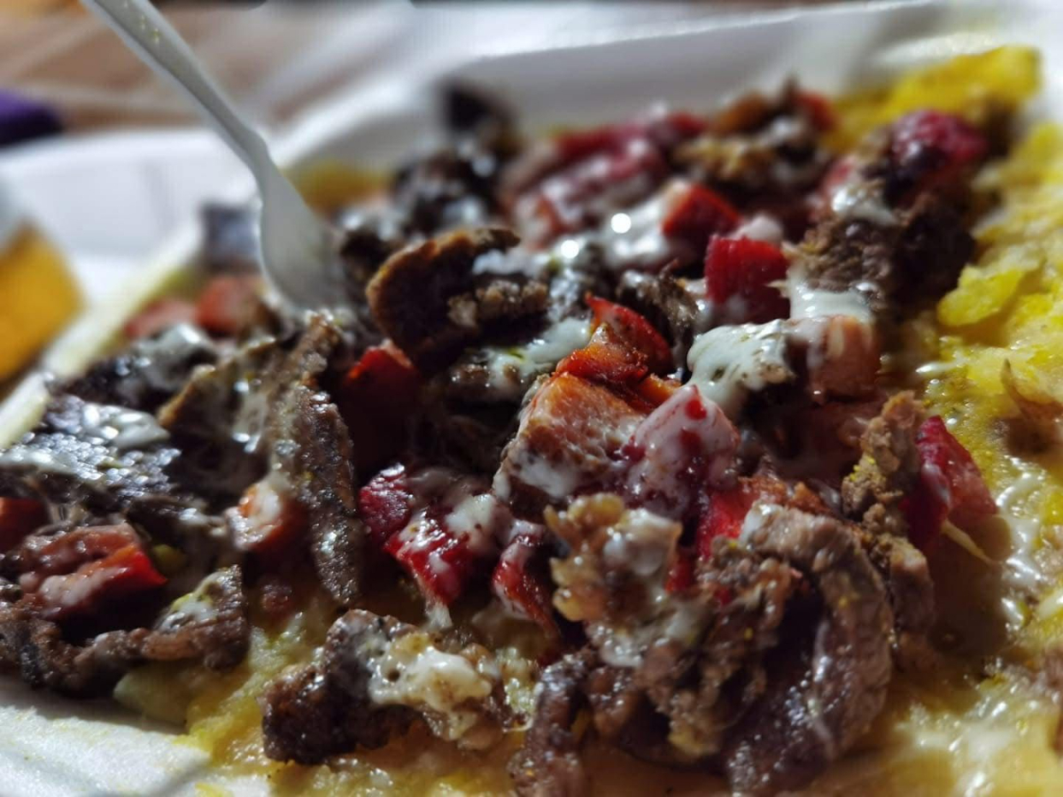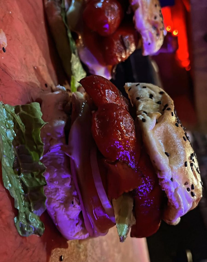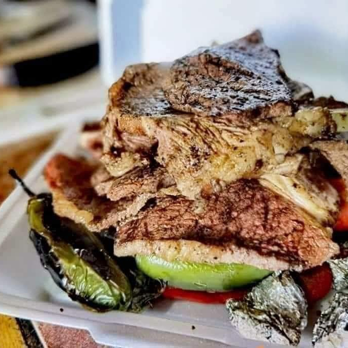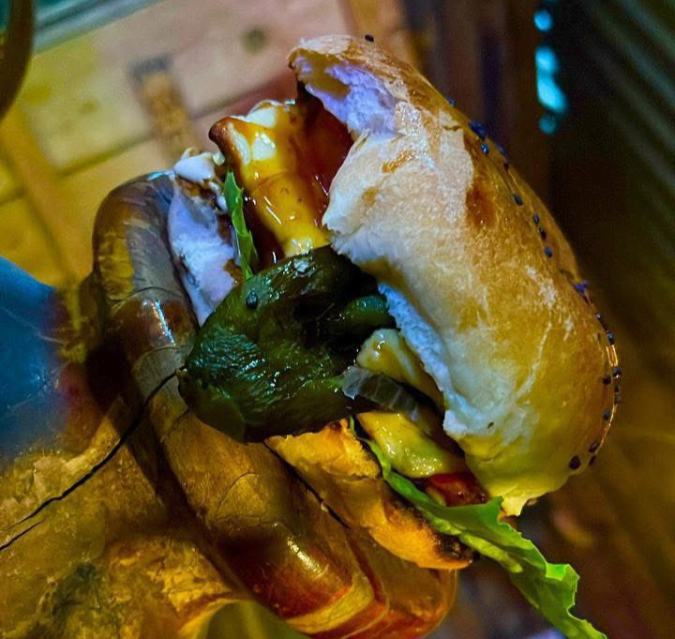 Pan, carne, queso asadero, chilaca asada, toque de salsa soya, verduras y aderezos.