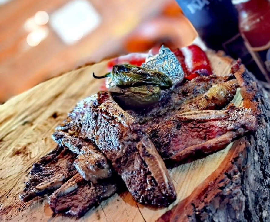Paquete de costillita cargada asada que incluye salchicha campestre, cebollitas, tortillas, toreados, y una papa asada.