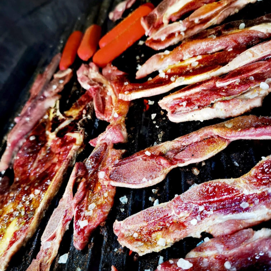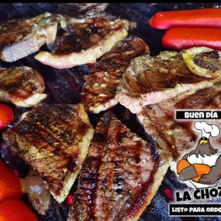 Paquete de costillita cargada asada que incluye salchicha campestre, cebollitas, tortillas, toreados, y dos papas asadas.