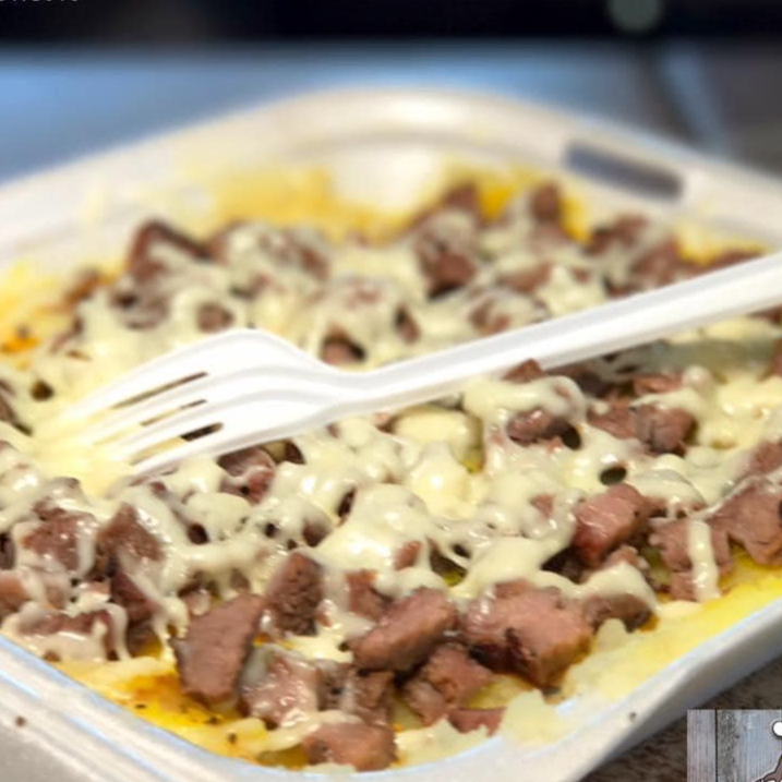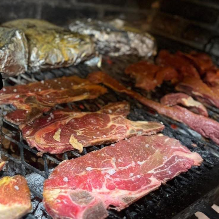 Paquete de arrachera asada que incluye salchicha campestre, cebollitas, tortillas, toreados, y dos papas asadas.