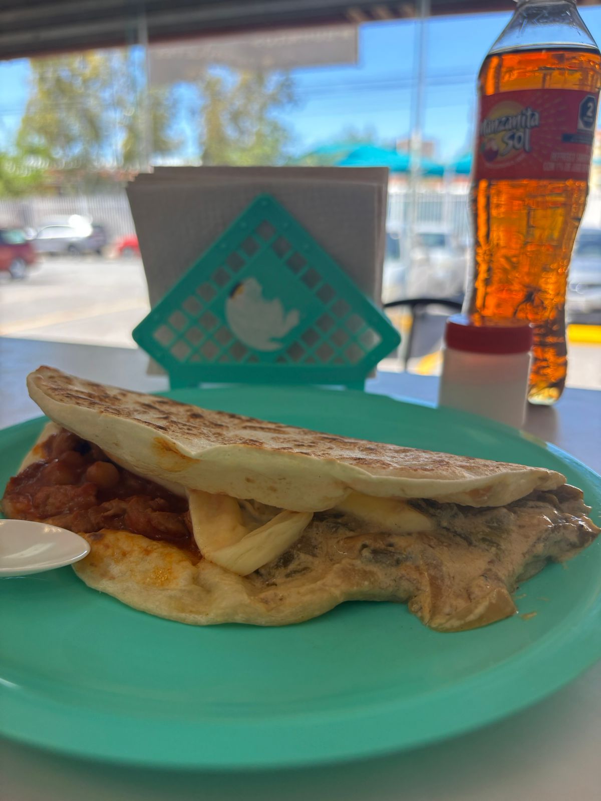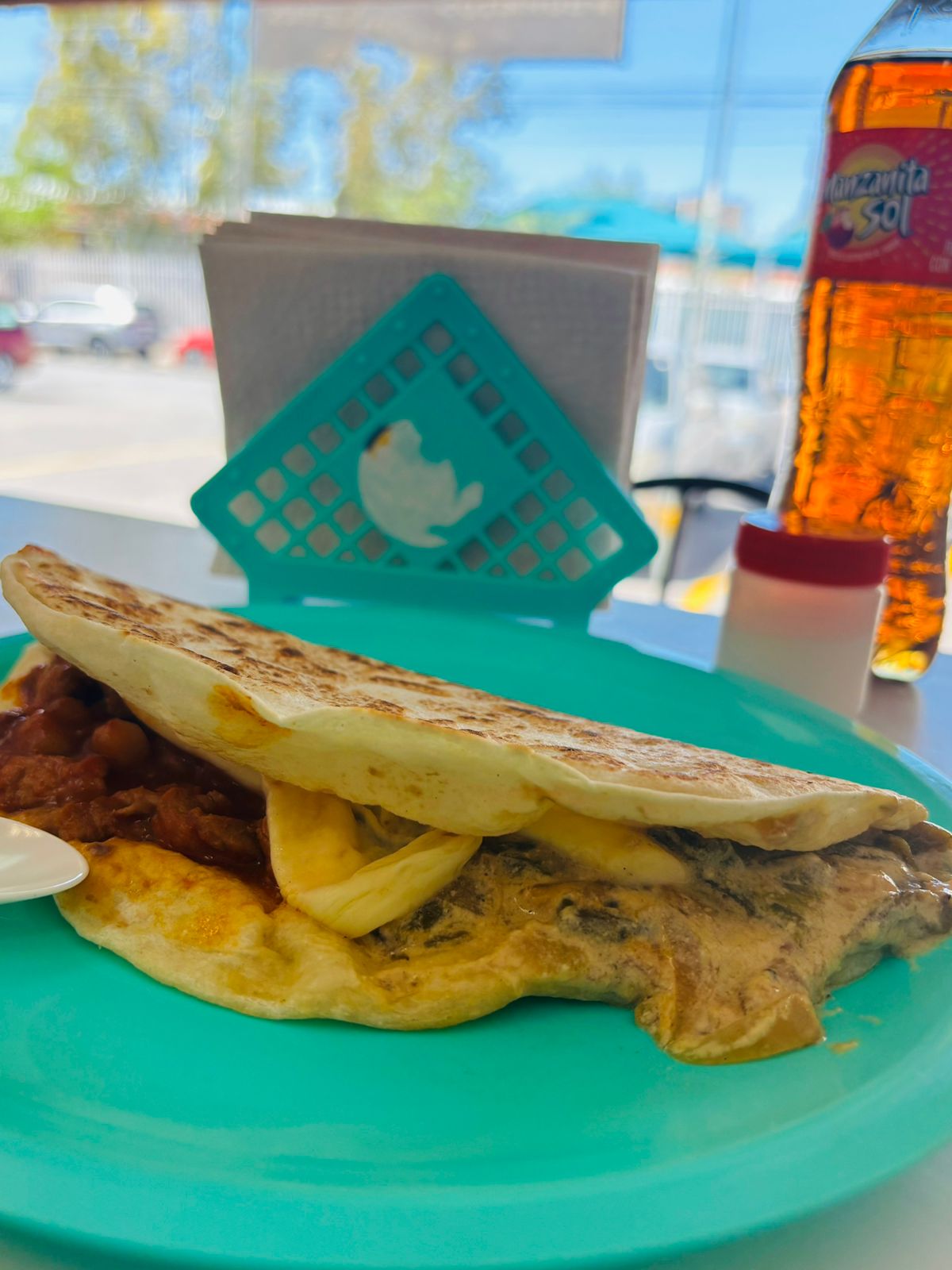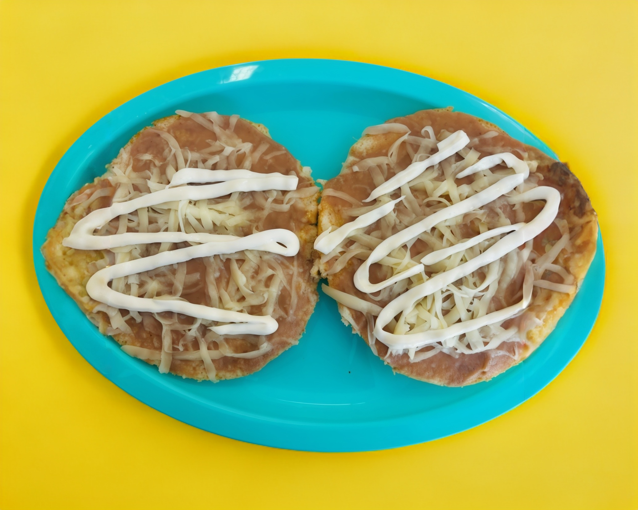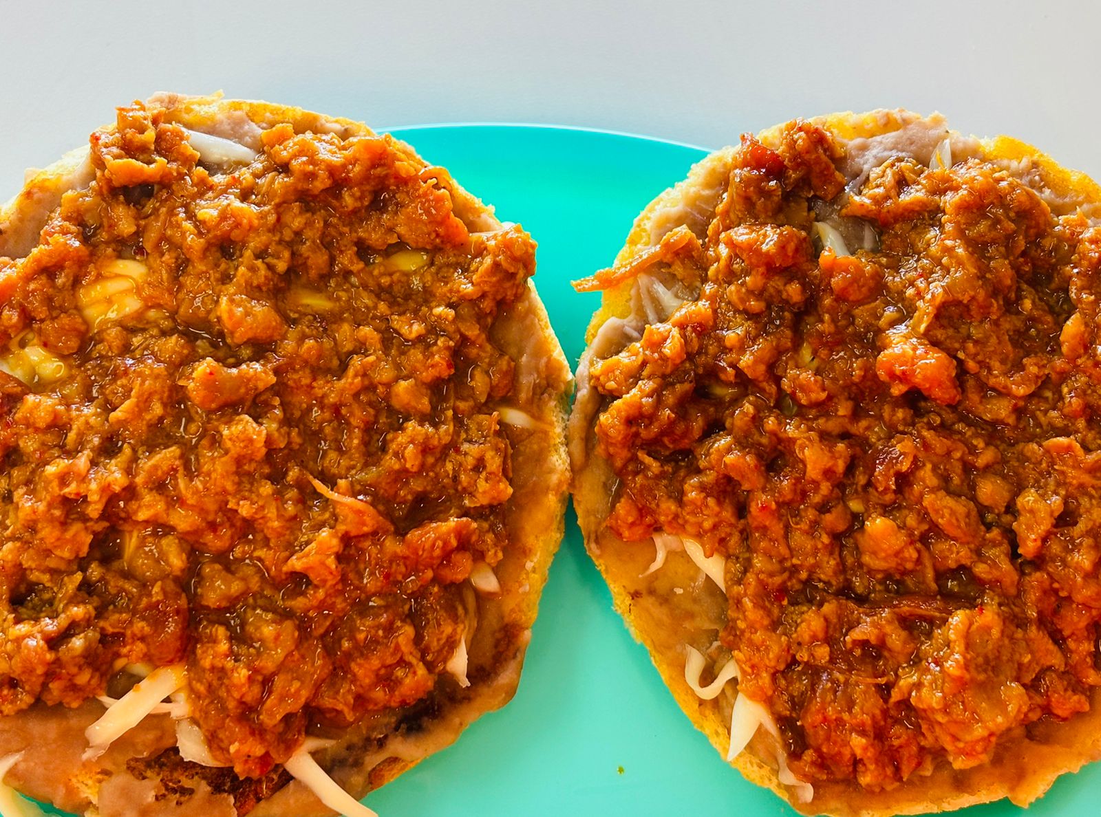 2 mitades de pan tostado con mantequilla, frijoles, queso y un guisado