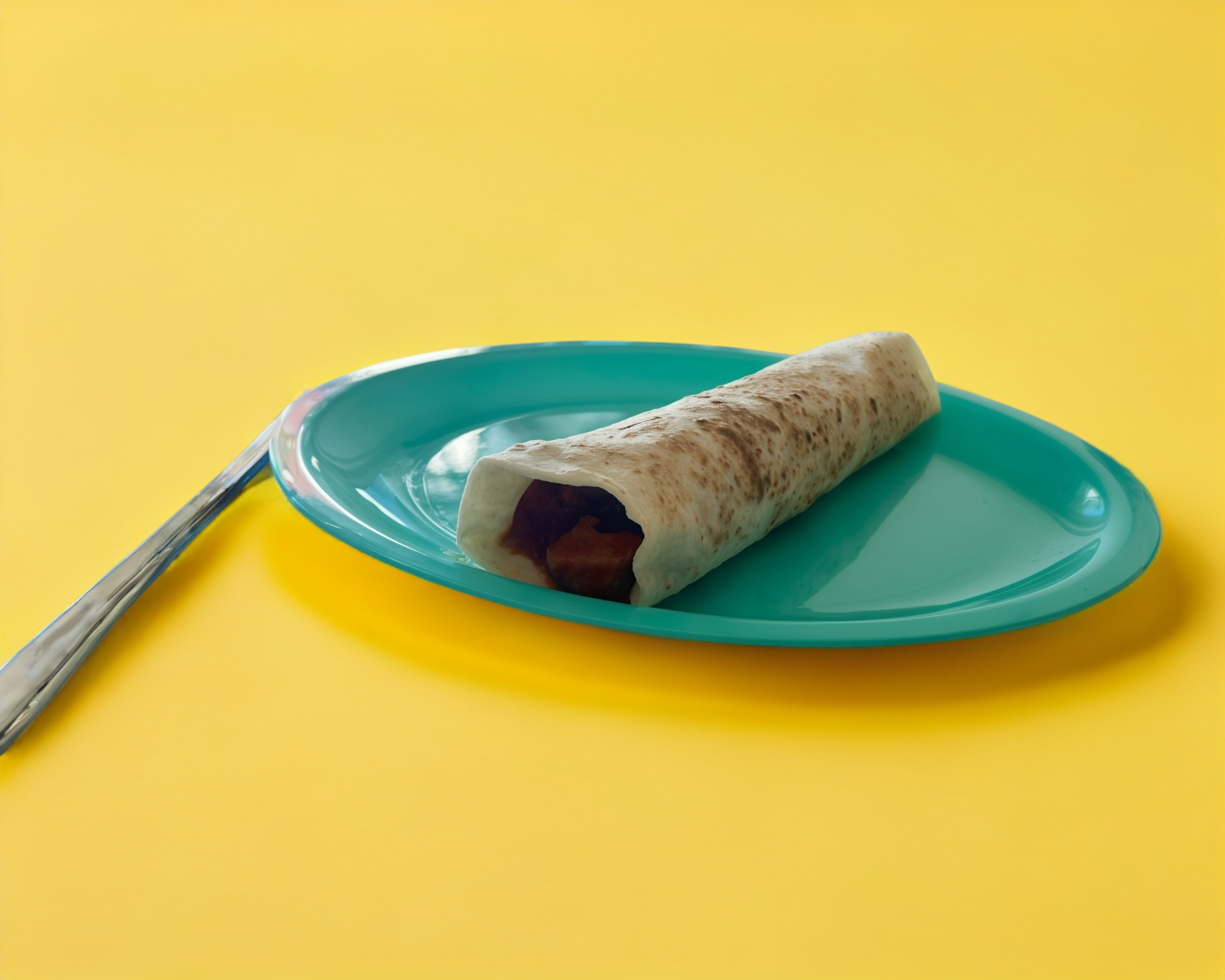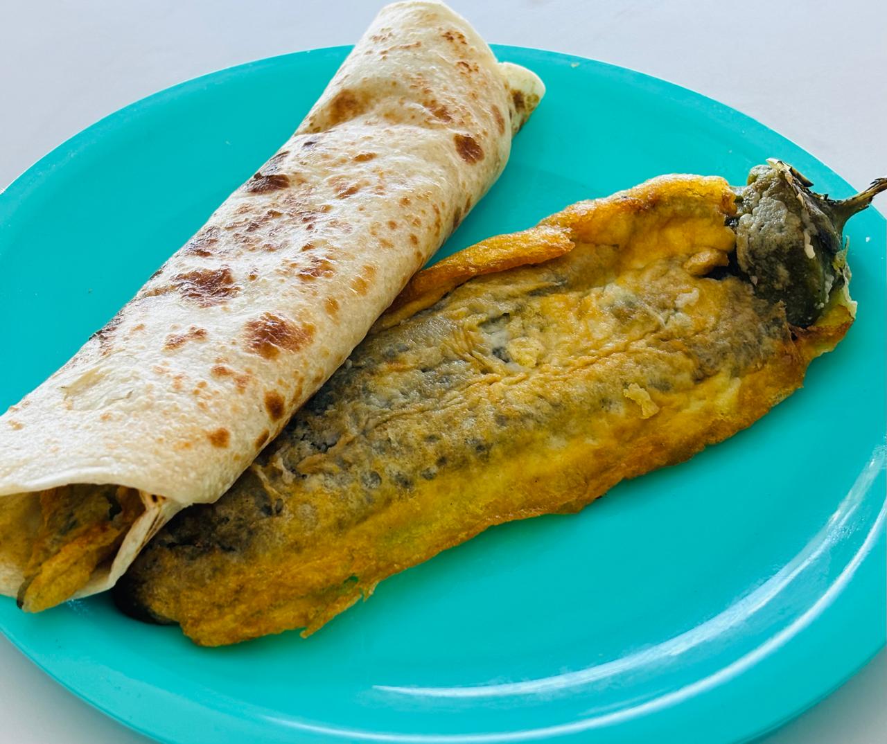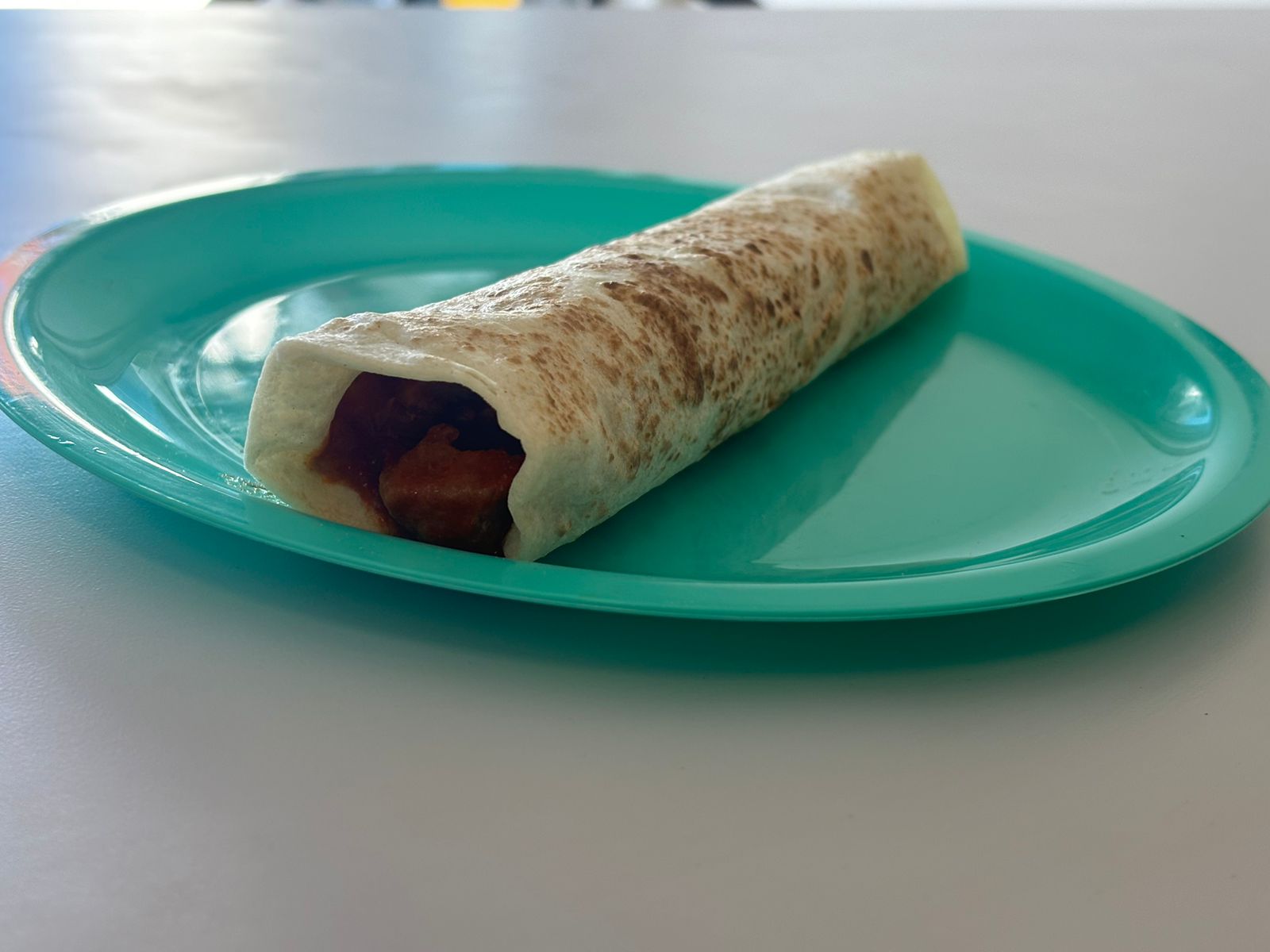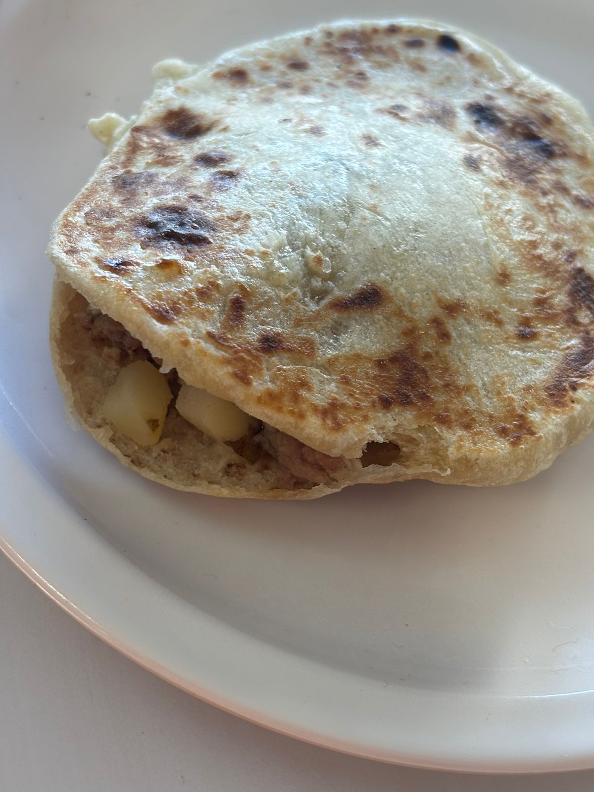 2 mitades de pan tostado con mantequilla, frijoles, queso y un guisado
