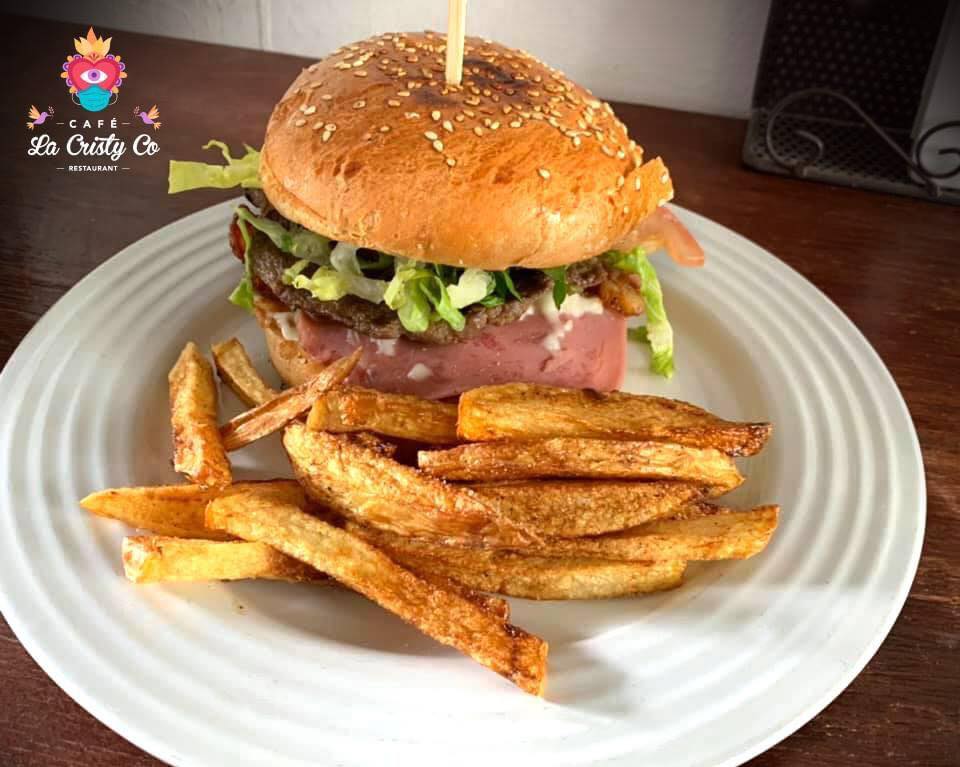 Doble porción de carne preparada en casa, tocino, jamón, queso, lechuga, tomate y aguacate. Acompañada de papas fritas.