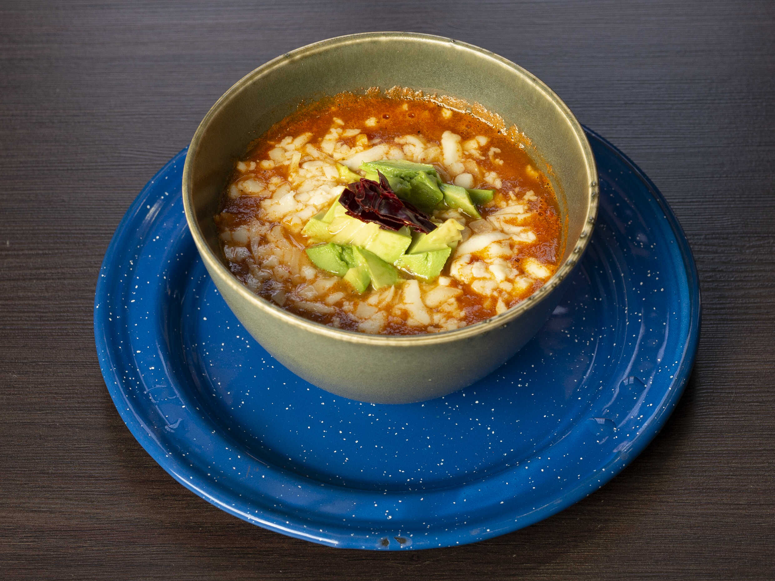 Salsa casera 100%, tiritas fritas de tortilla de maíz, aguacate, queso.