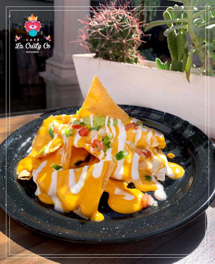 Totopos de maíz bañados en queso amarillo, con crema y pico de gallo.