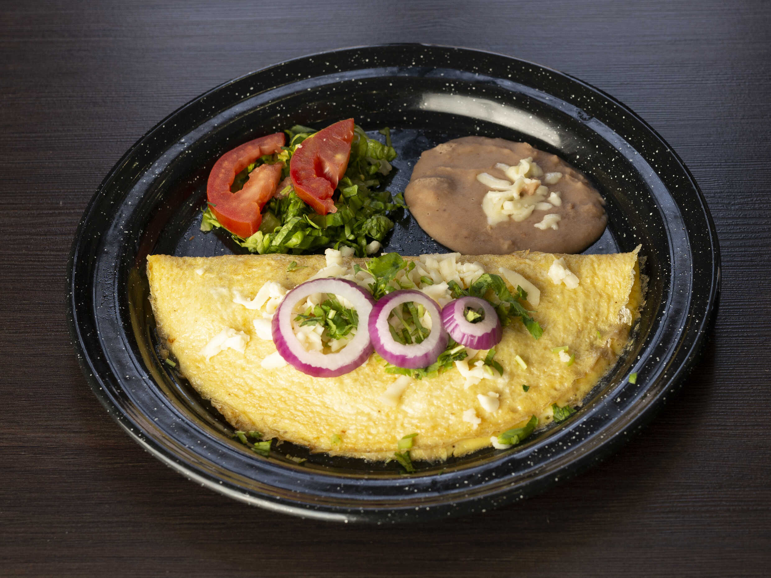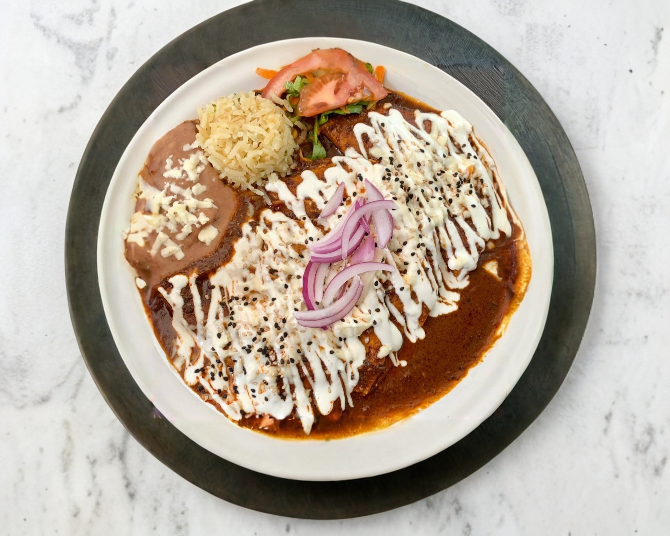 Deliciosas enmoladas de pollo o queso, con quesito rallado, crema, cilantro y cebolla. Acompañadas de frijoles, arroz y verdura.