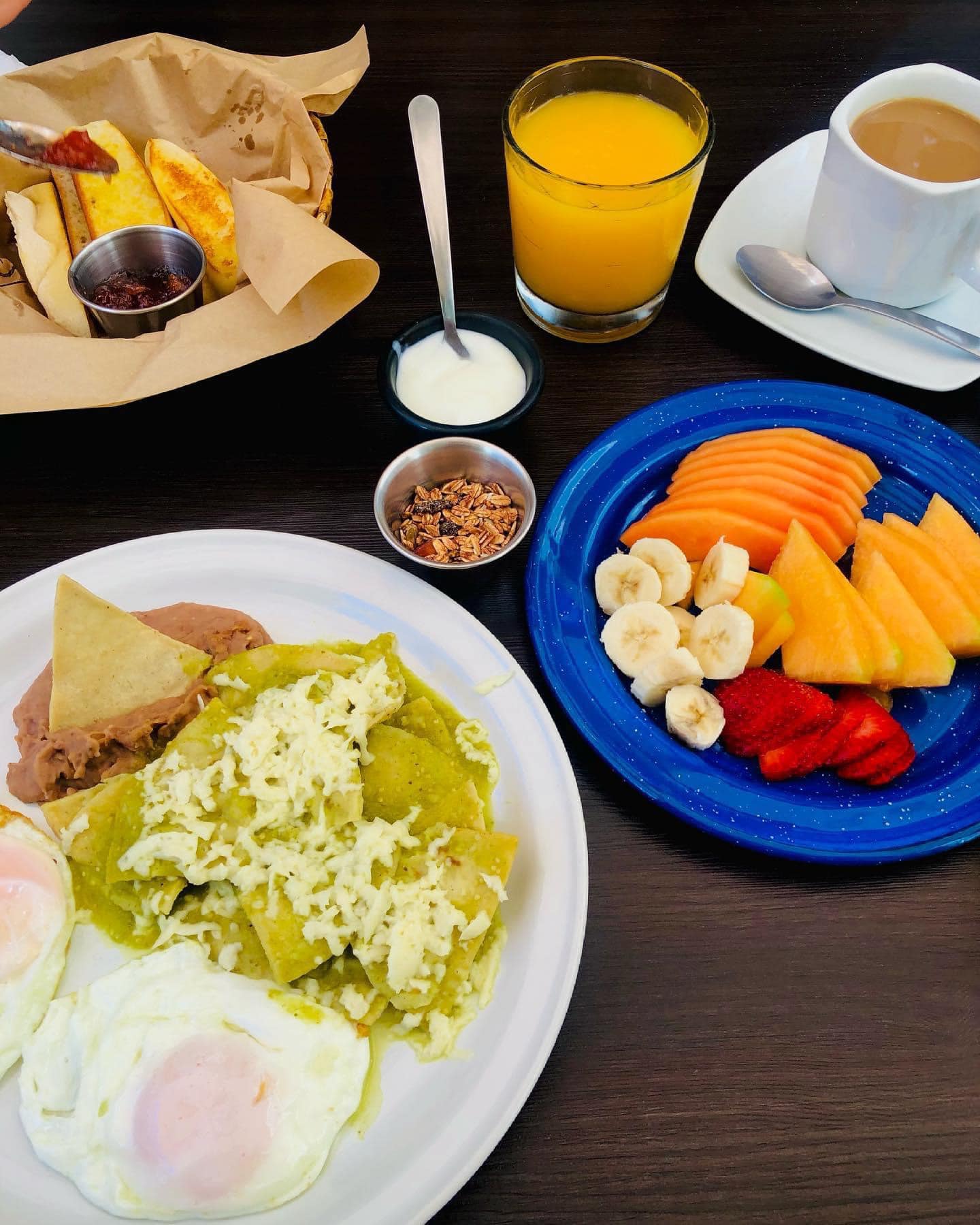 2 huevos (revueltos o estrellados), chilaquiles, frijolitos y jugo de naranja.
