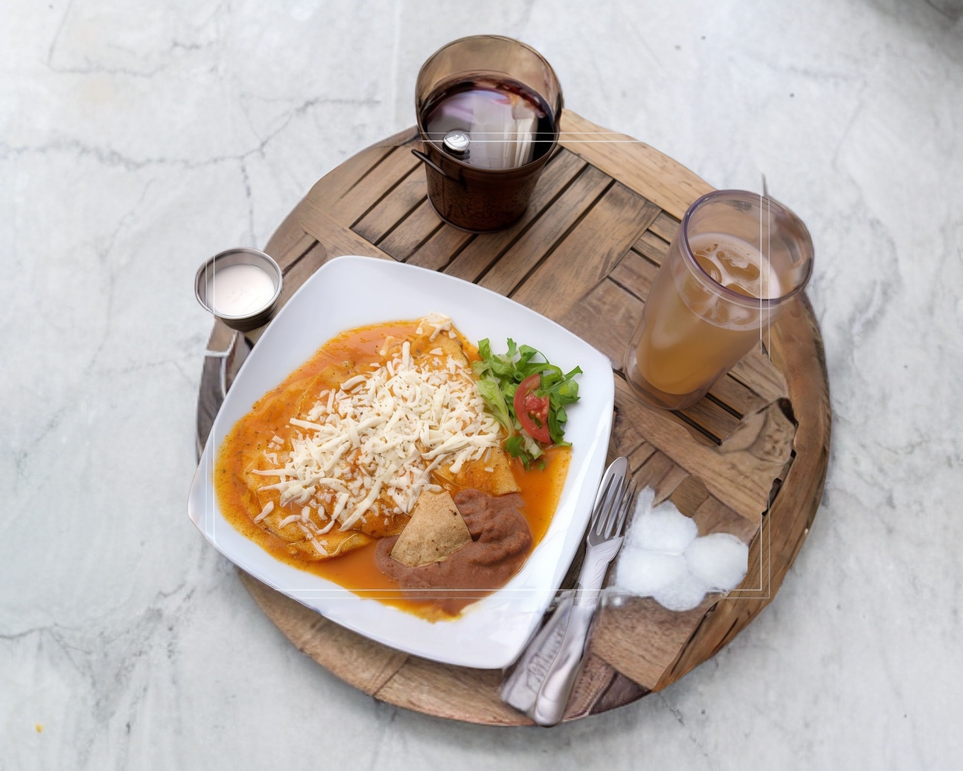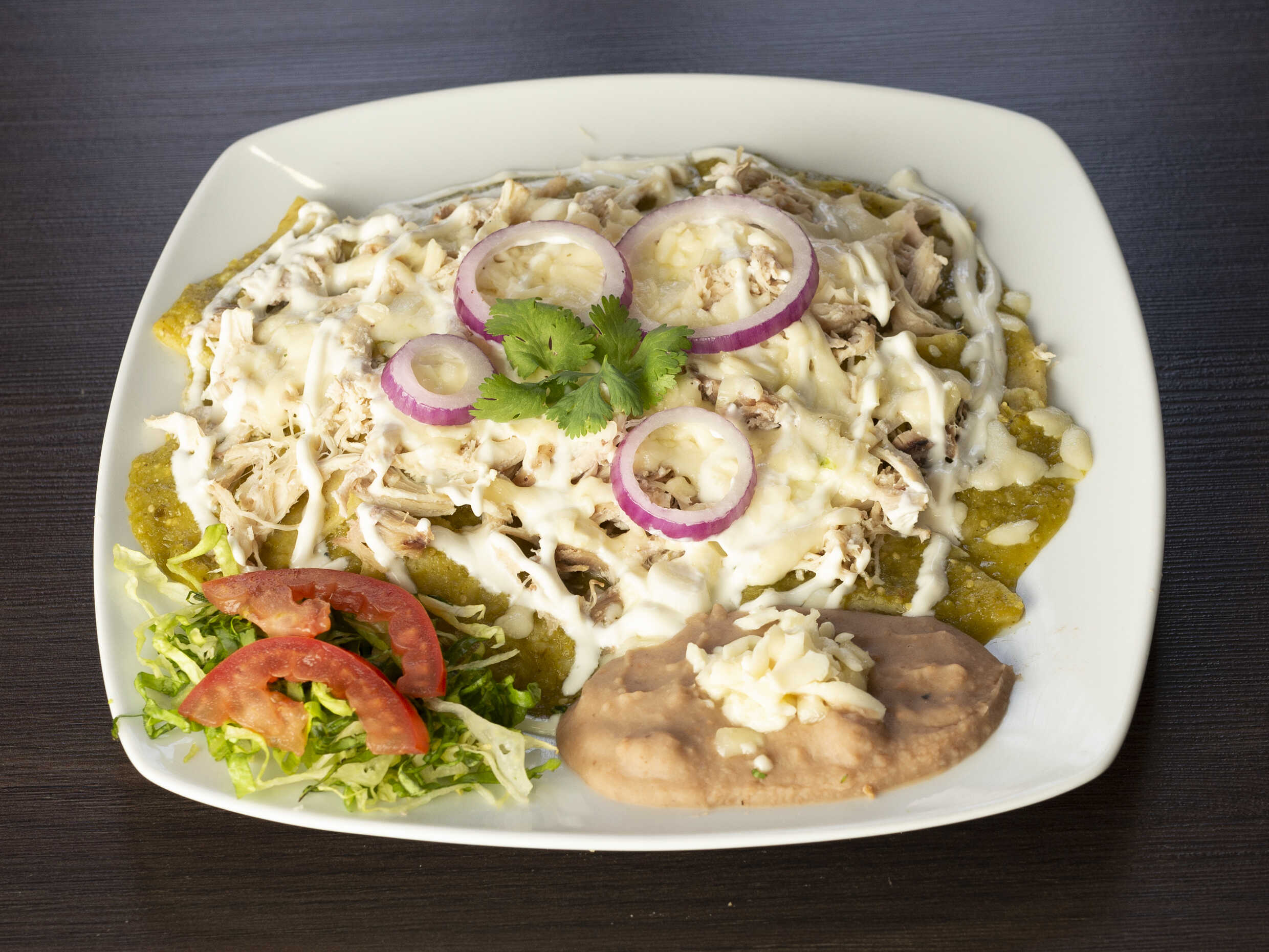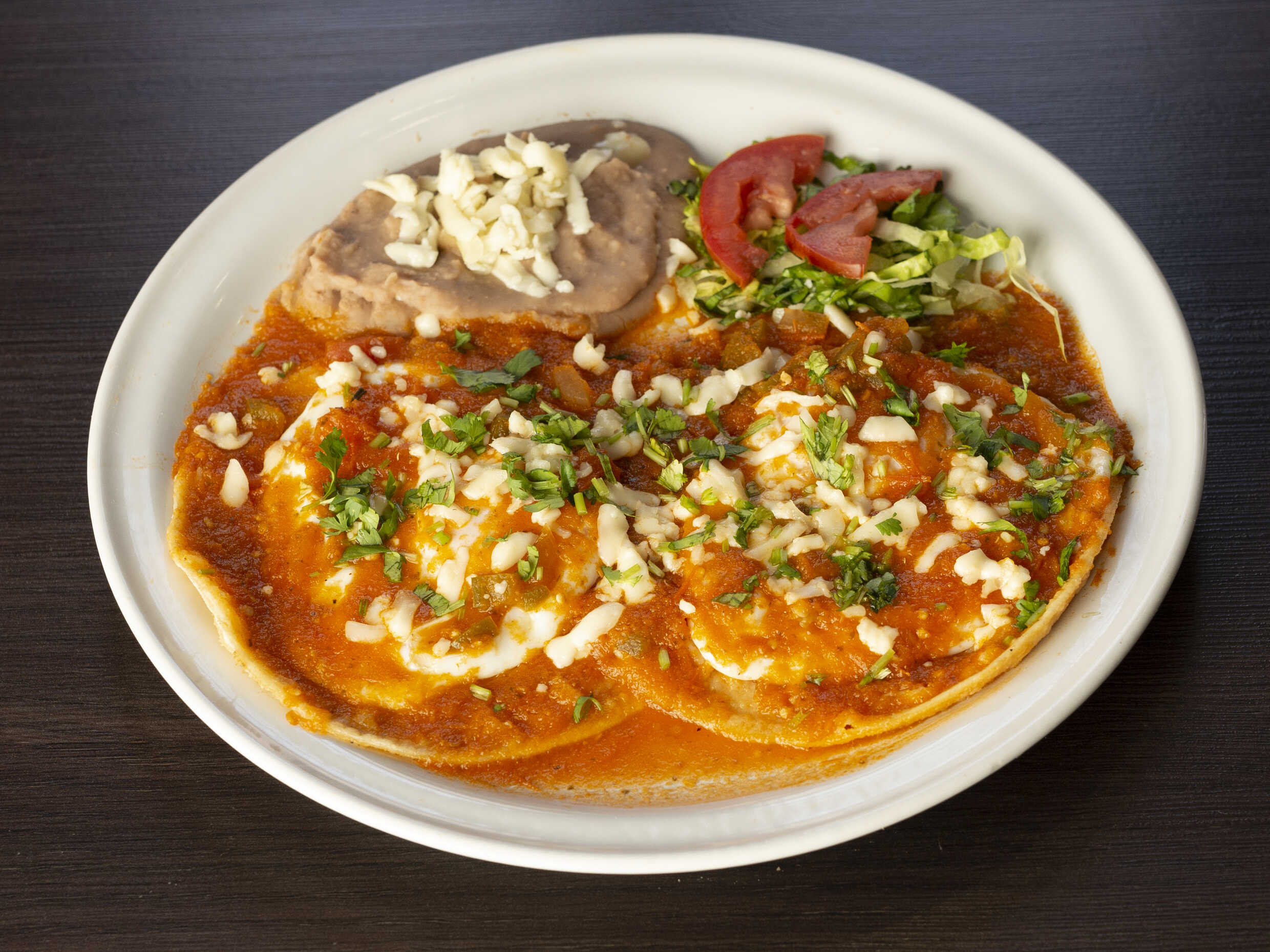 Tortillas fritas bañadas en salsa (roja o verde) y queso. Acompañados con frijolitos y verdura.