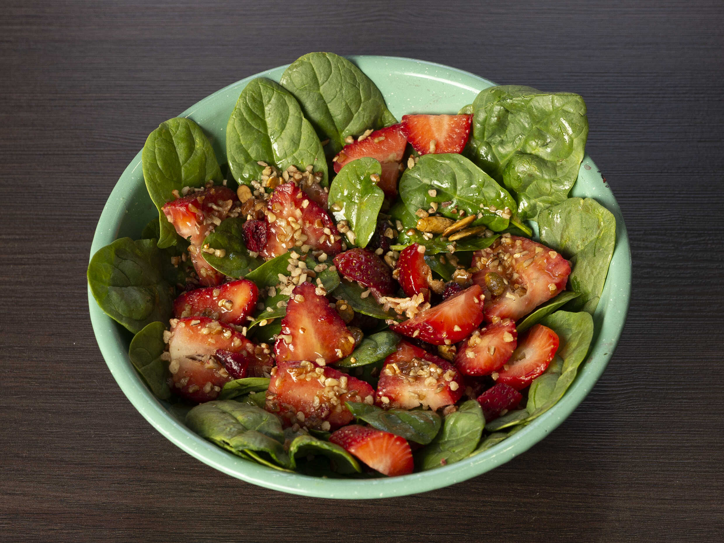 Espinacas, tocino, nuez, fresa, con aceite de olivo y vinagreta balsámico.