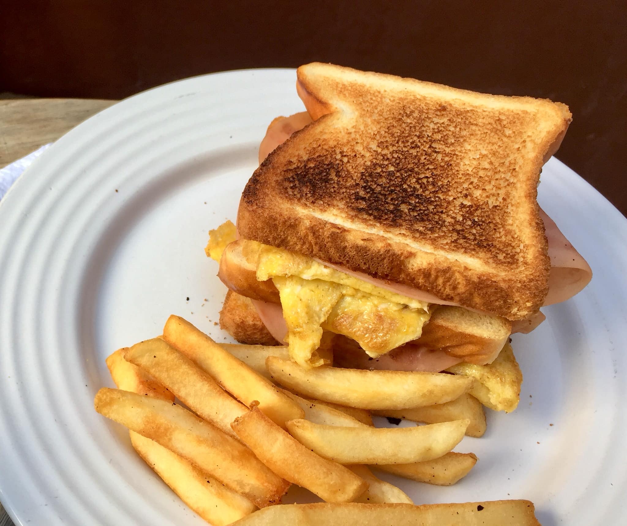 Sandwich de huevo con doble jamón, queso y papas fritas.
