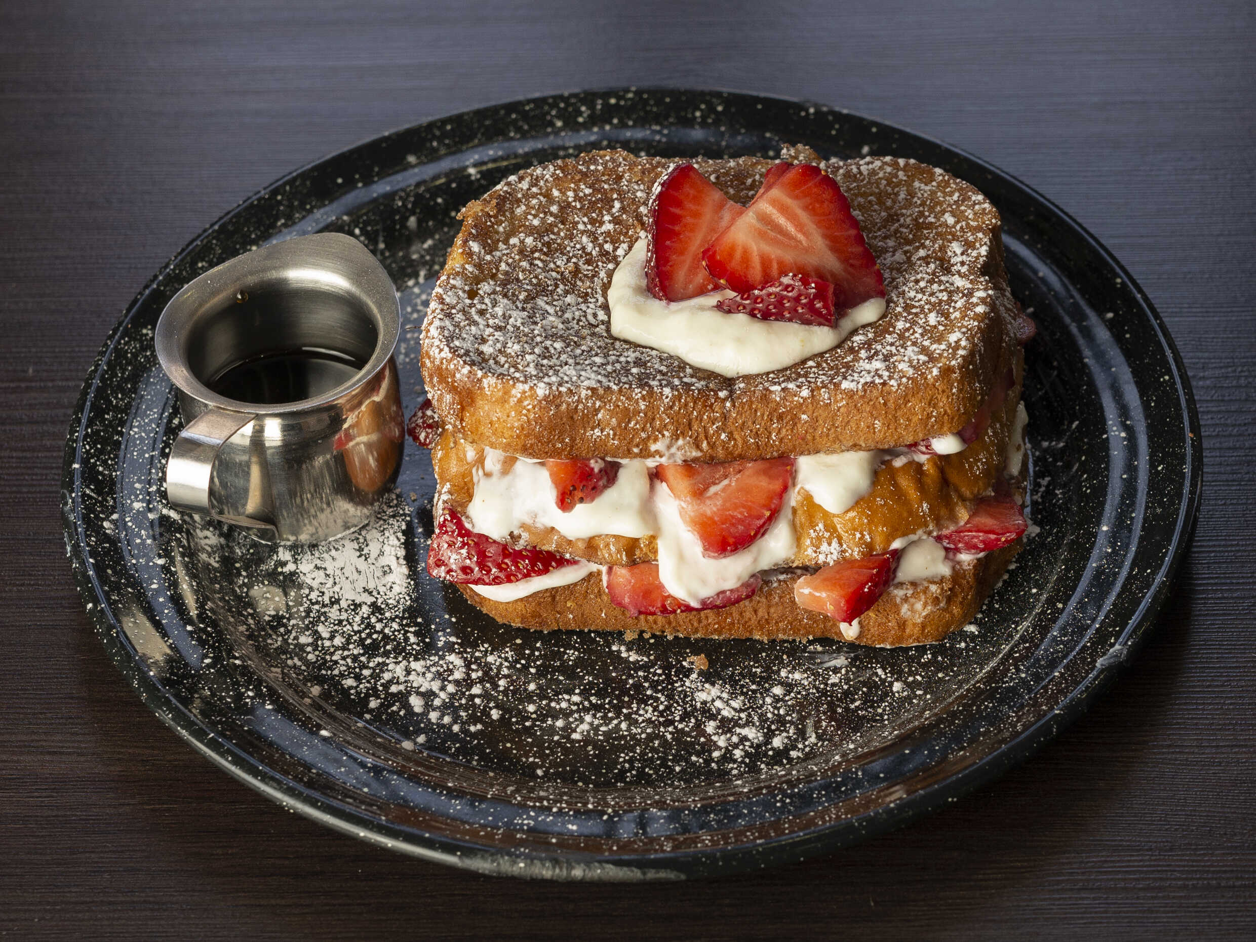 3 rebanadas de pan con relleno de queso, crema, frutillas, azúcar y canela.