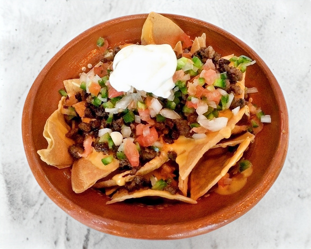 Totopos de maíz bañados en queso amarillo, con top sirloin, crema y pico de gallo.