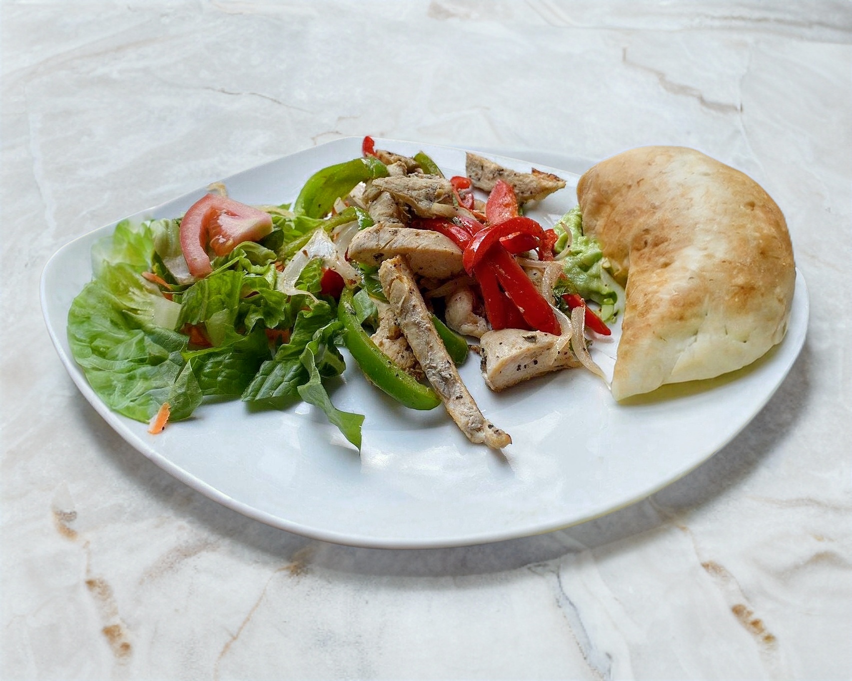 Pechuga de pollo en tiritas con pimientos y cebolla. Acompañadas de puré de aguacate, verdura y totillas.