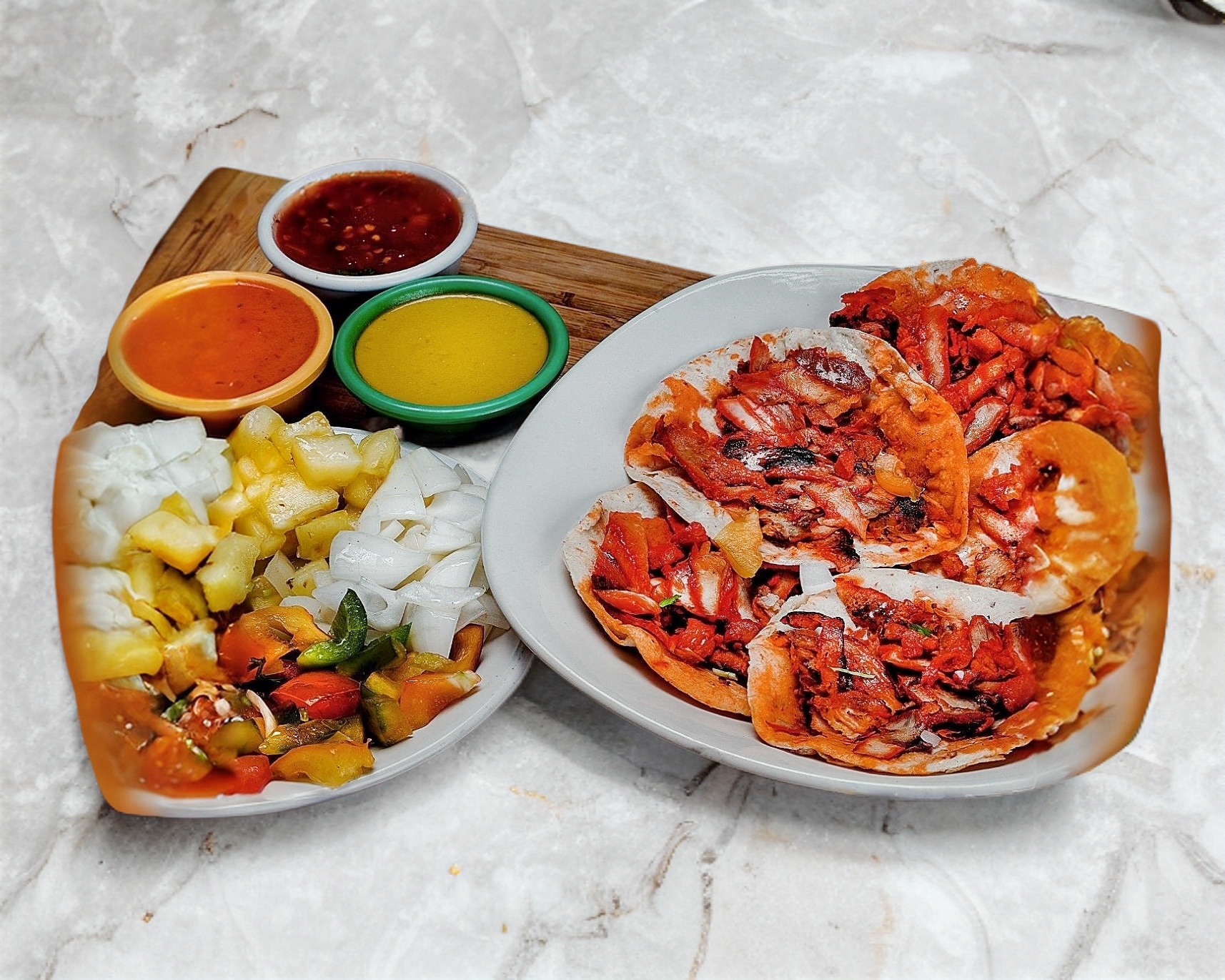 1 kg. de carne de pastor, tortillas, salsas, limones, cebolla, cilantro y piña.
