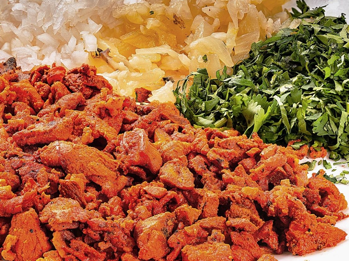 Pastor, bistec, tocino, jamon, chorizo, cebolla, tortillas y limones.