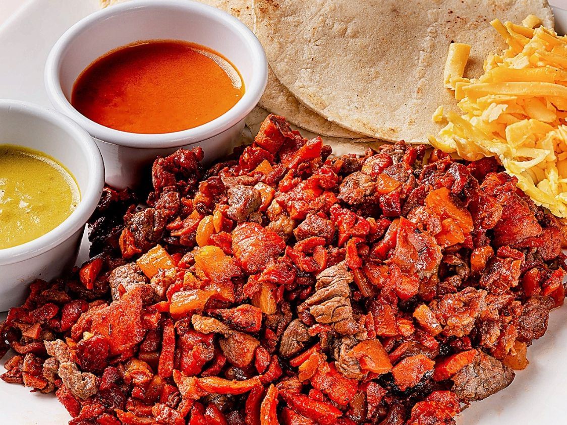 BISTEC,PASTOR,MORRON,QUESO,TORTILLA DE MAIZ