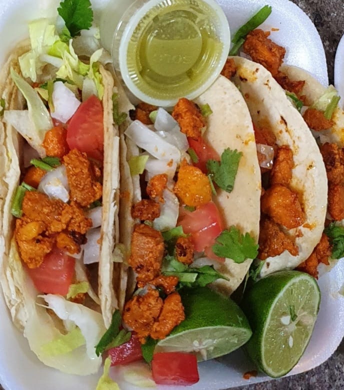 3 Tacos de Camarón capeado, crema, tomate, cebolla, clantro y limón.