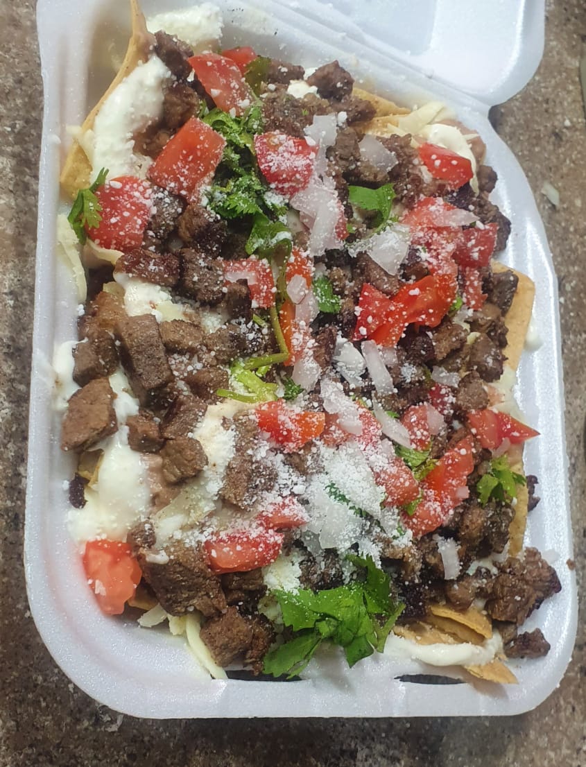 Bistec, crema, guacamole, queso gratinado, frijoles refritos, queso en polvo, cebolla, tomate y cilantro
