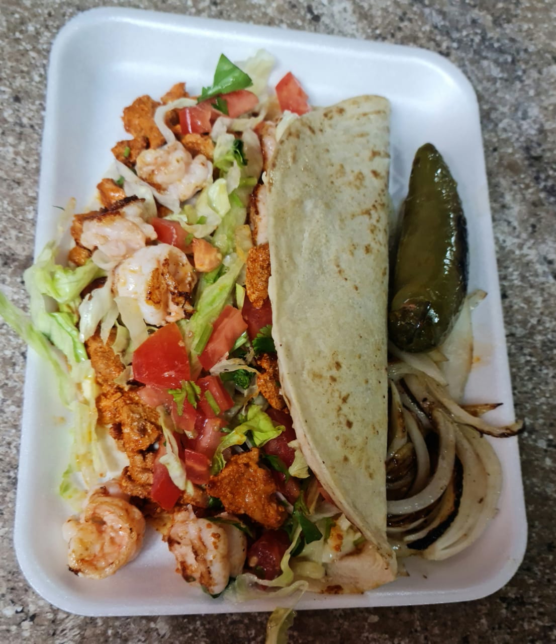 Carne, queso gratinado, camarón, cebolla, cilantro, lechuga, tomate cebolla frita y jalapeño toreado
