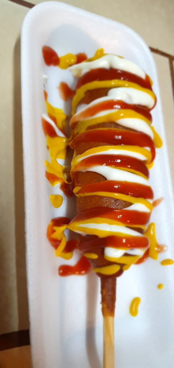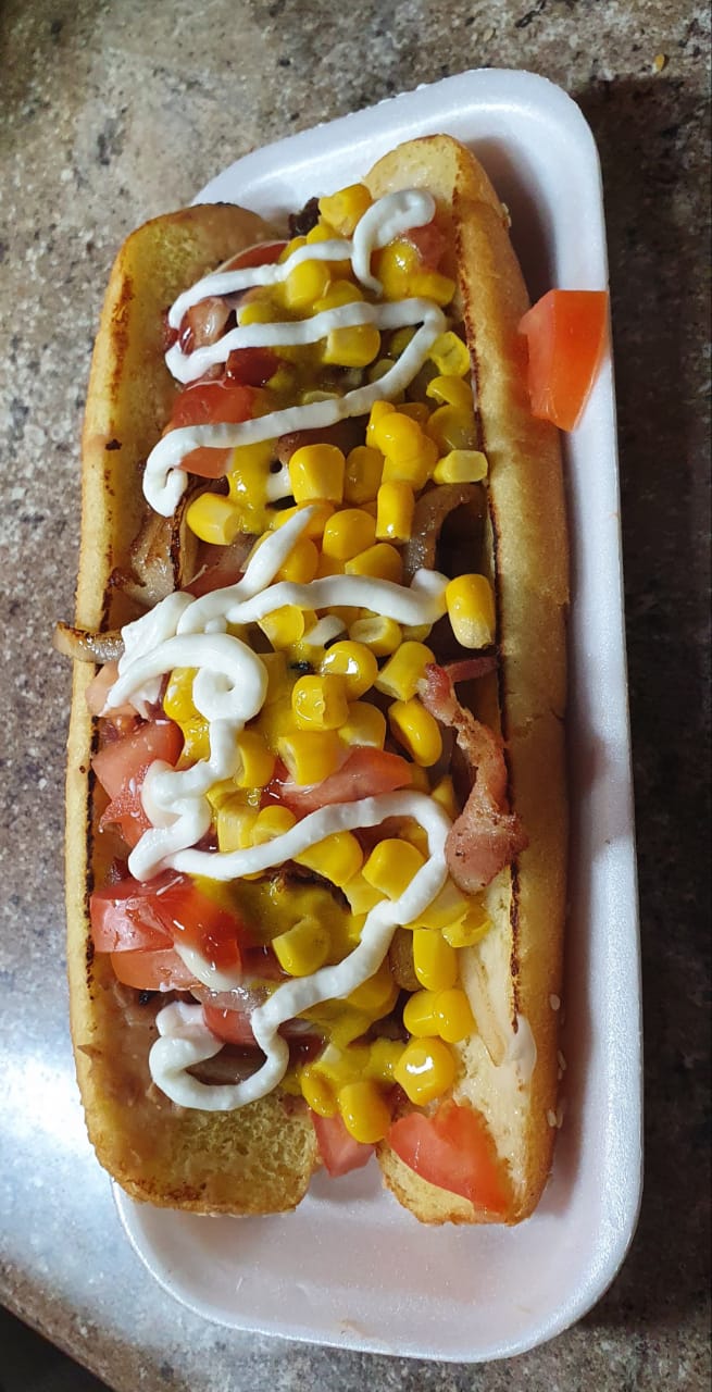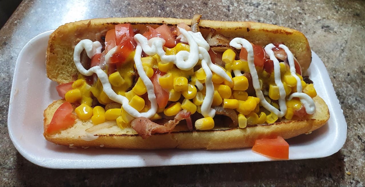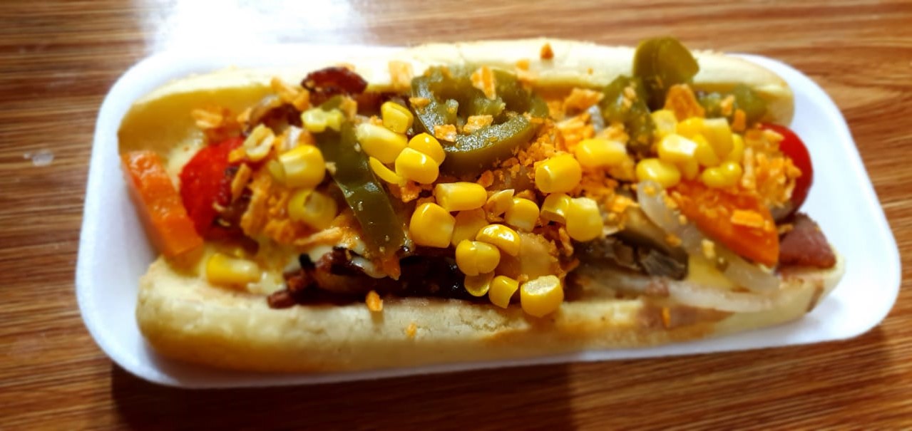 Salchicha de pavo, Mayonesa, frijoles refritos, tocino, cebolla frita. Ruffles, champiñones, elote, pepinillos, catsup y mostaza