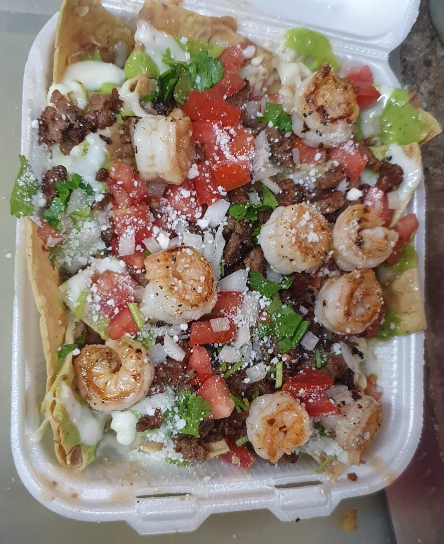 Carne, camarón, queso amarillo, guacamole, crema, cebolla, cilantro, tomate, queso en polvo