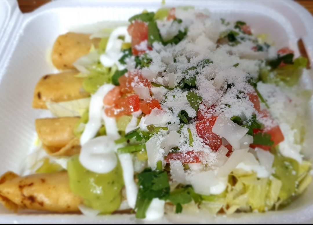 4 flautas de pollo bañadas en guacamole crema lechuga tomate cilantro y queso en polvo