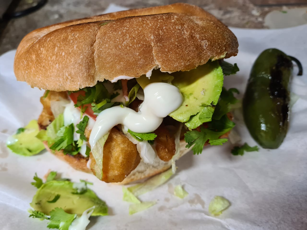 Camarones capeados, crema, aguacate, lechuga, tomate, cebolla, cilantro y mayonesa