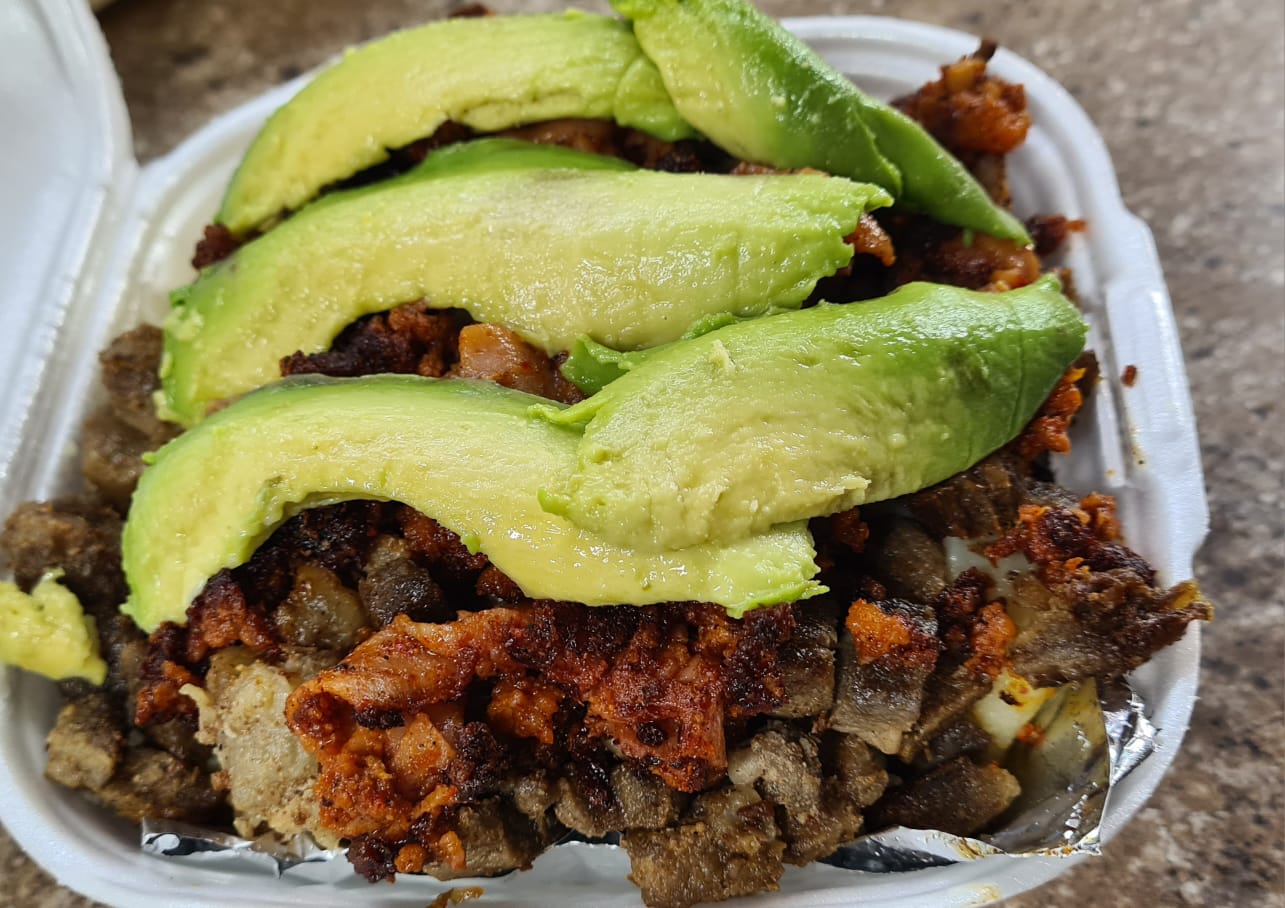 Carne, guacamole, queso gratinado, cebolla y cilantro.