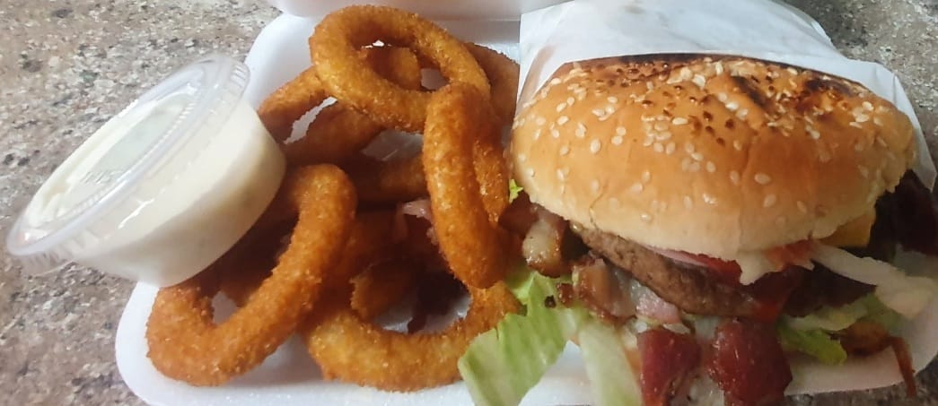 Hamburguesa con camarones, papas y aros