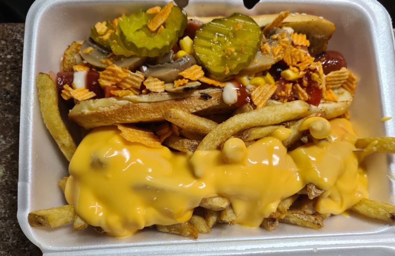 Salchicha para asar, tocino, cebolla frita, mayonesa, frijoles refritos, rufles, champiñones, pepinillos, catsup y mostaza
