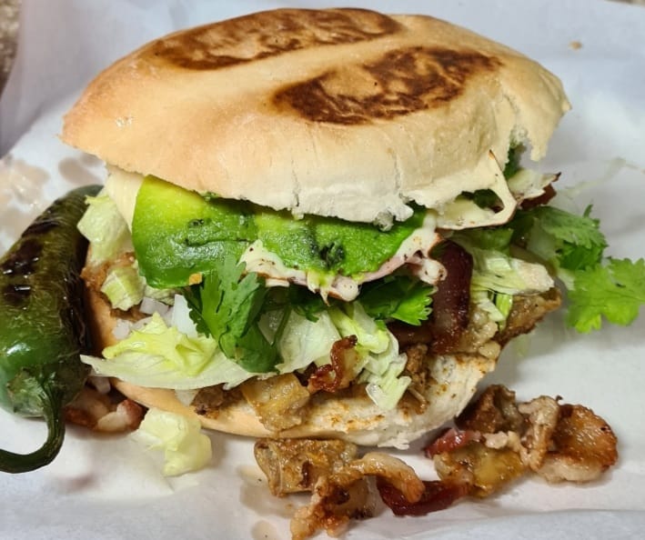 Carne, jamón, queso gratinado, aguacate, tocino, lechuga, tomate, cebolla, cilantro y mayonesa