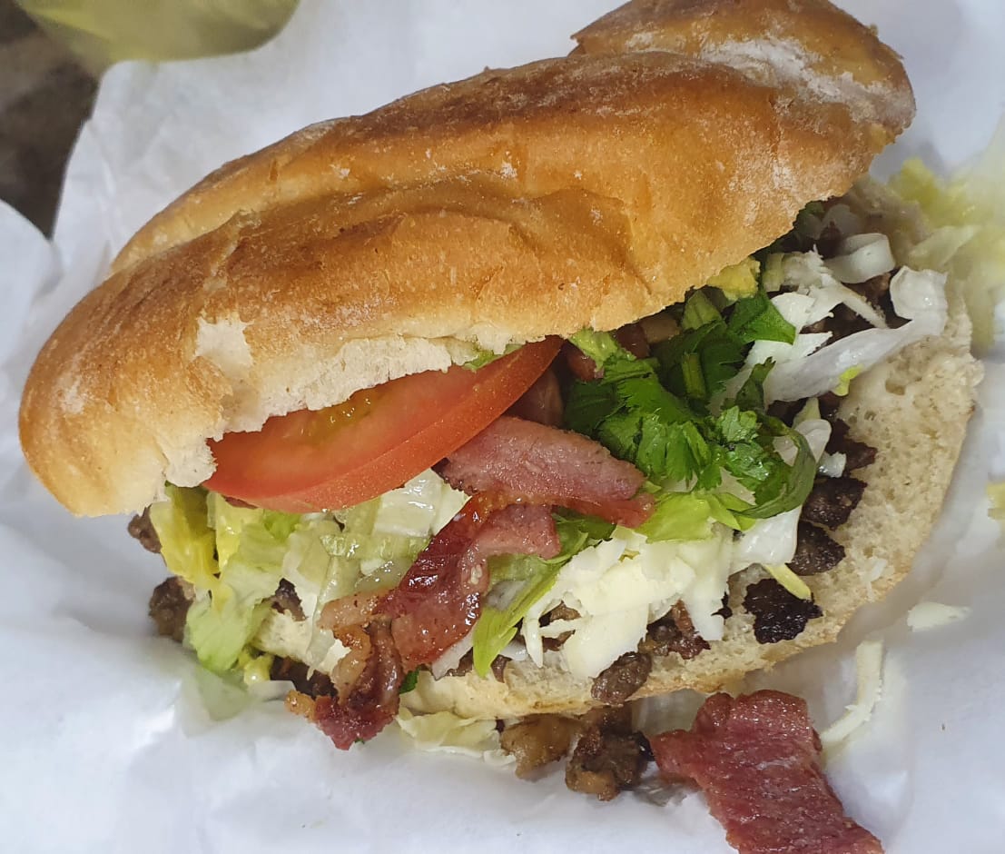 Carne, jamón, queso gratinado, tocino, aguacate, lechuga, tomate, cebolla, cilantro y mayonesa