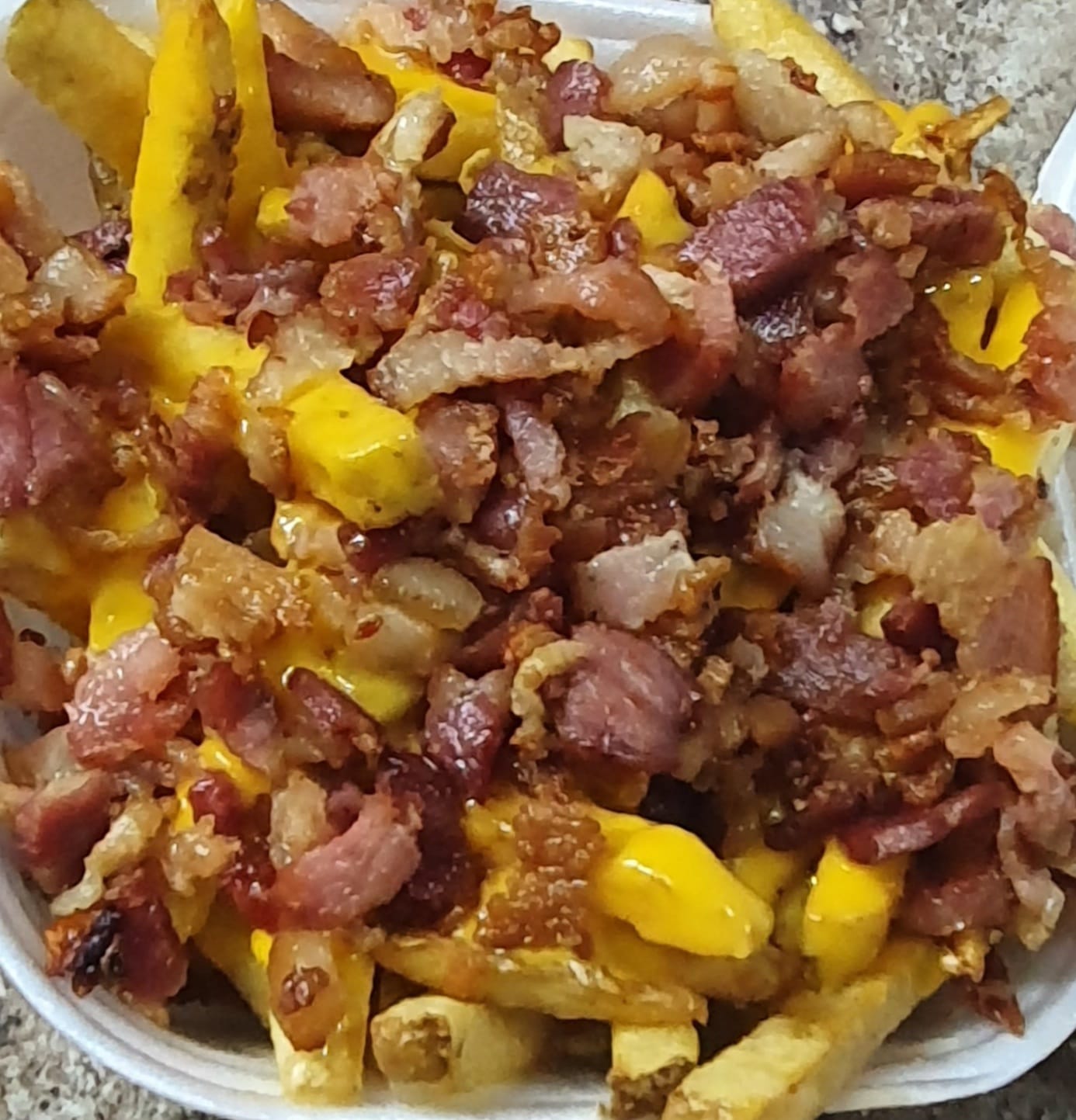 Papas francesas, tocino y queso amarillo