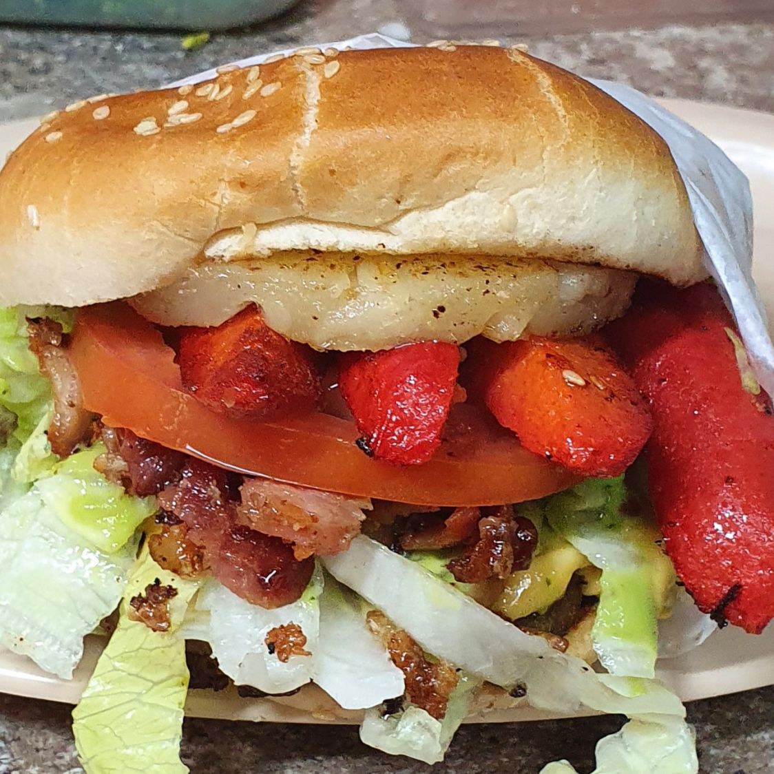 Carne piña tocino guacamole lechuga tomate pepinillo catsup mayonesa y mostaza