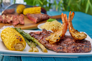 Rib eye, camarones acompañados de elote dulce y cebolla asada 360 g.