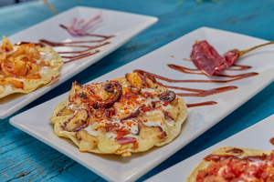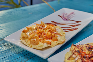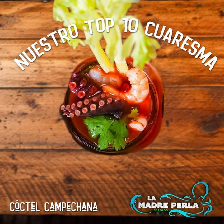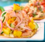 Marisco de tu preferencia, mango, cebolla, pepino y chamoy, montado e aderezo de mango habanero.