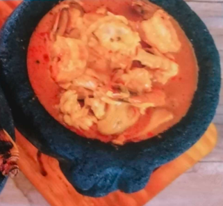 Camarón guisado con apio, tomate, cebolla y queso.