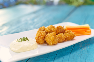 Filete de pescado empanizado en pequeñas porciones con papas alas francesas ,aderezo de la casa y una limonda