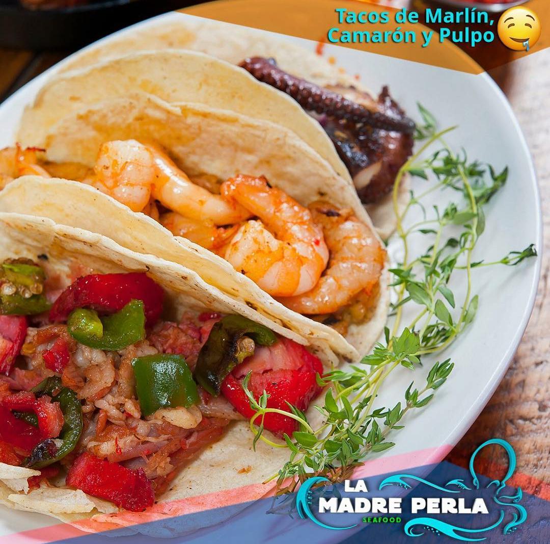 Camarón, pulpo y pescado, bañado en crema de chipotle y queso.