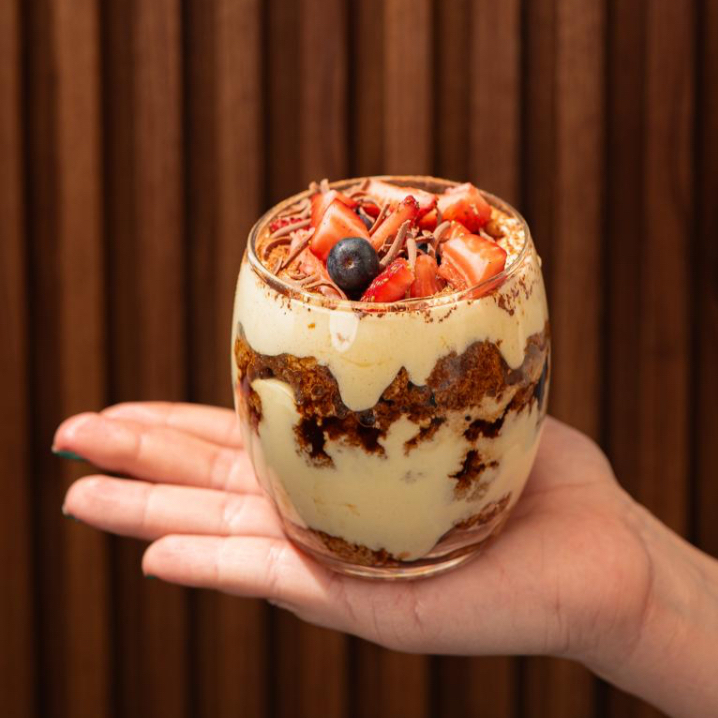 Bizcocho de vainilla con jarabe de café, crema de mascarpone y cacao.