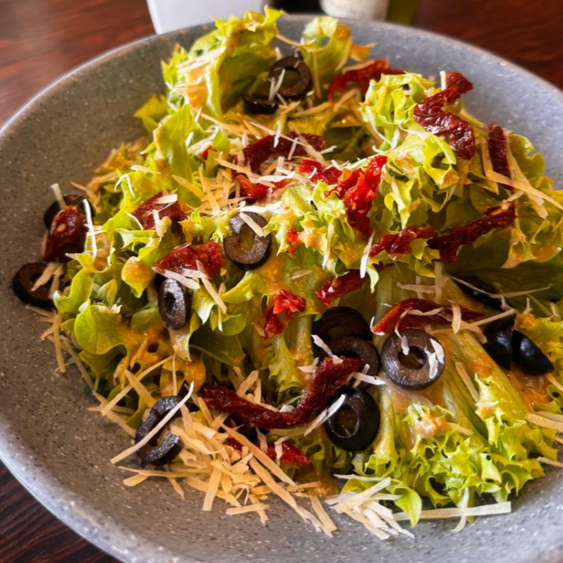 Mix de lechuga italiana, aderezo césar, tomate deshidratado, aceitunas negras y queso parmesano