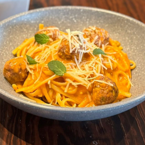 Fettuccini, albondigas de res, salsa boloñesa, queso parmesano rayado.