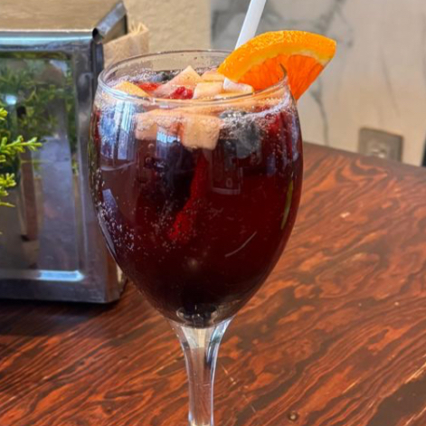 Bebida de vino tinto sin alcohol con mix de fruta fresca.