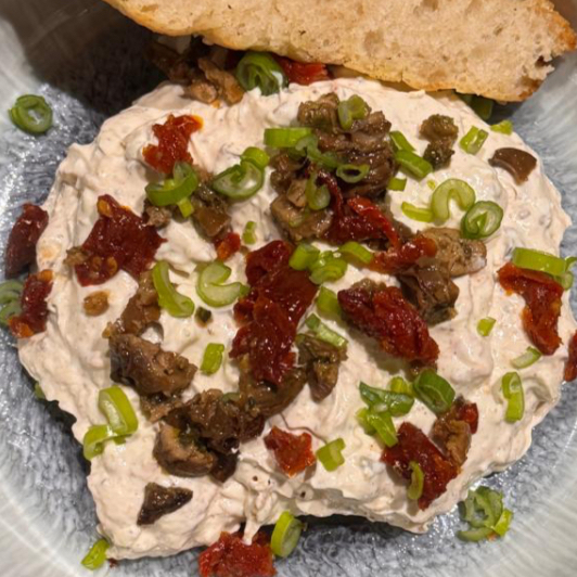 Dip cremoso con mezcla de ostiones ahumados y tomate deshidratado