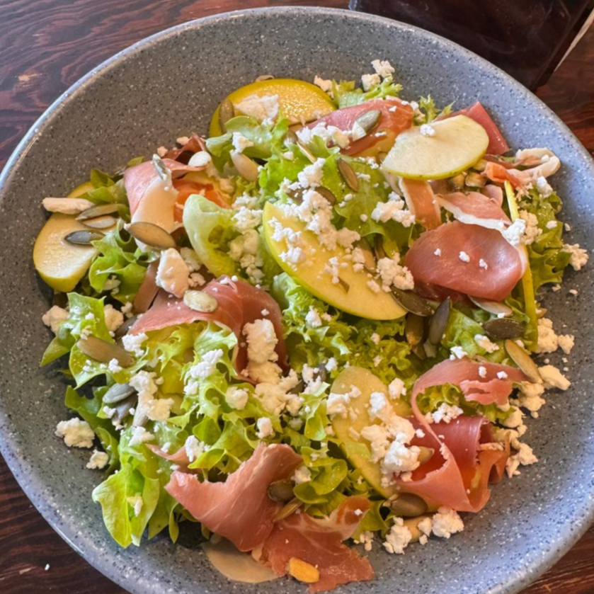 Mix de lechuga italiana, manzana, jamón serrano, queso cabra, pepitas caramelizadas.