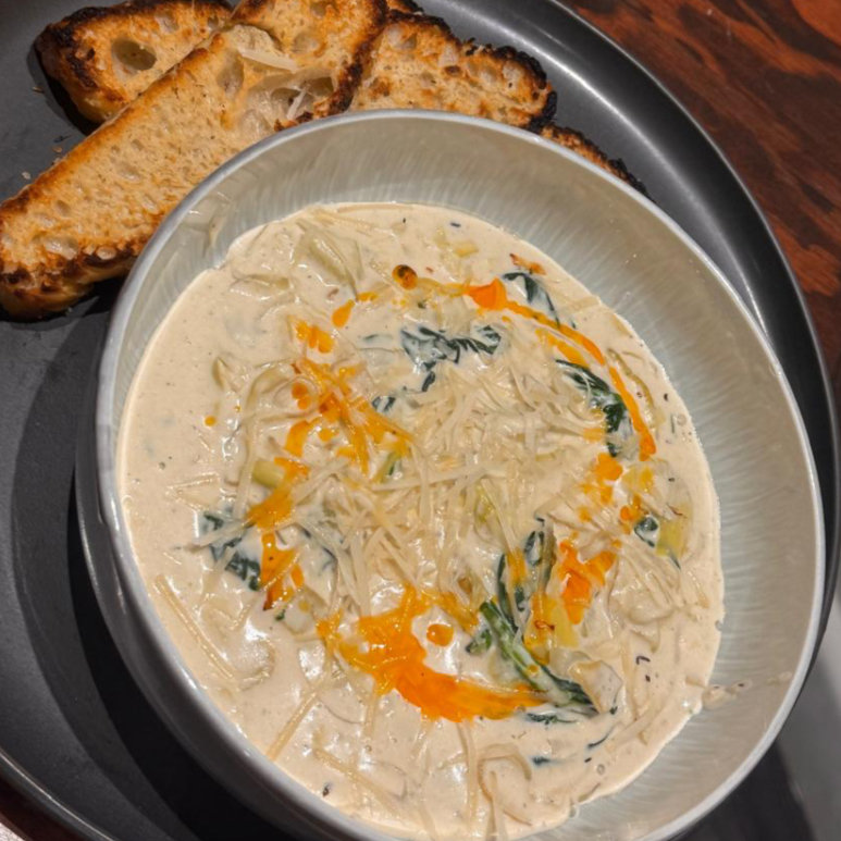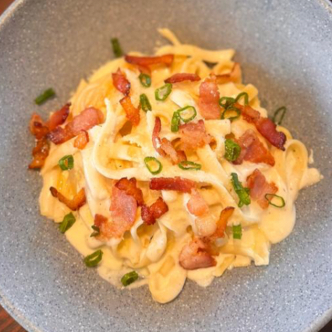Fettuccini, salsa tres quesos, tocino, cebolla cambray.