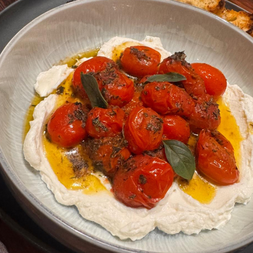 Tomates Cherry a las finas hierbas sobre suave queso ricota.