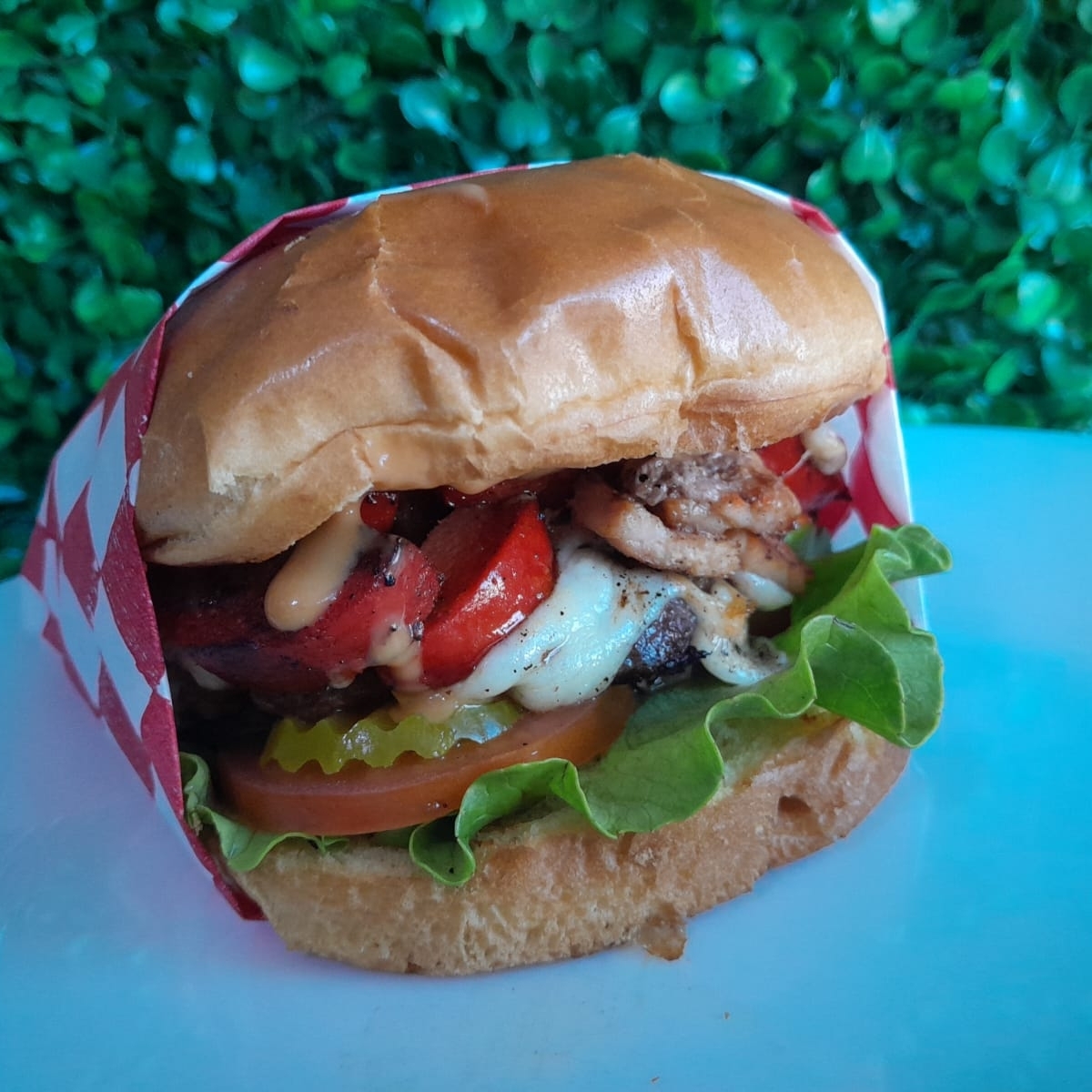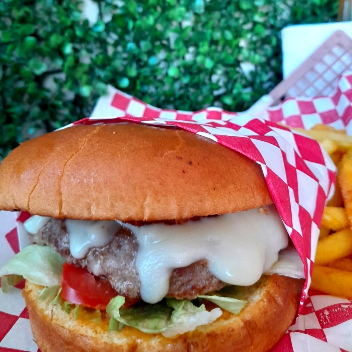 120 gr de jugosa carne de res sazonada. Con queso, lechuga, tomate, pepinillos, piña a la plancha en pan brioche y aderezo de la casa.