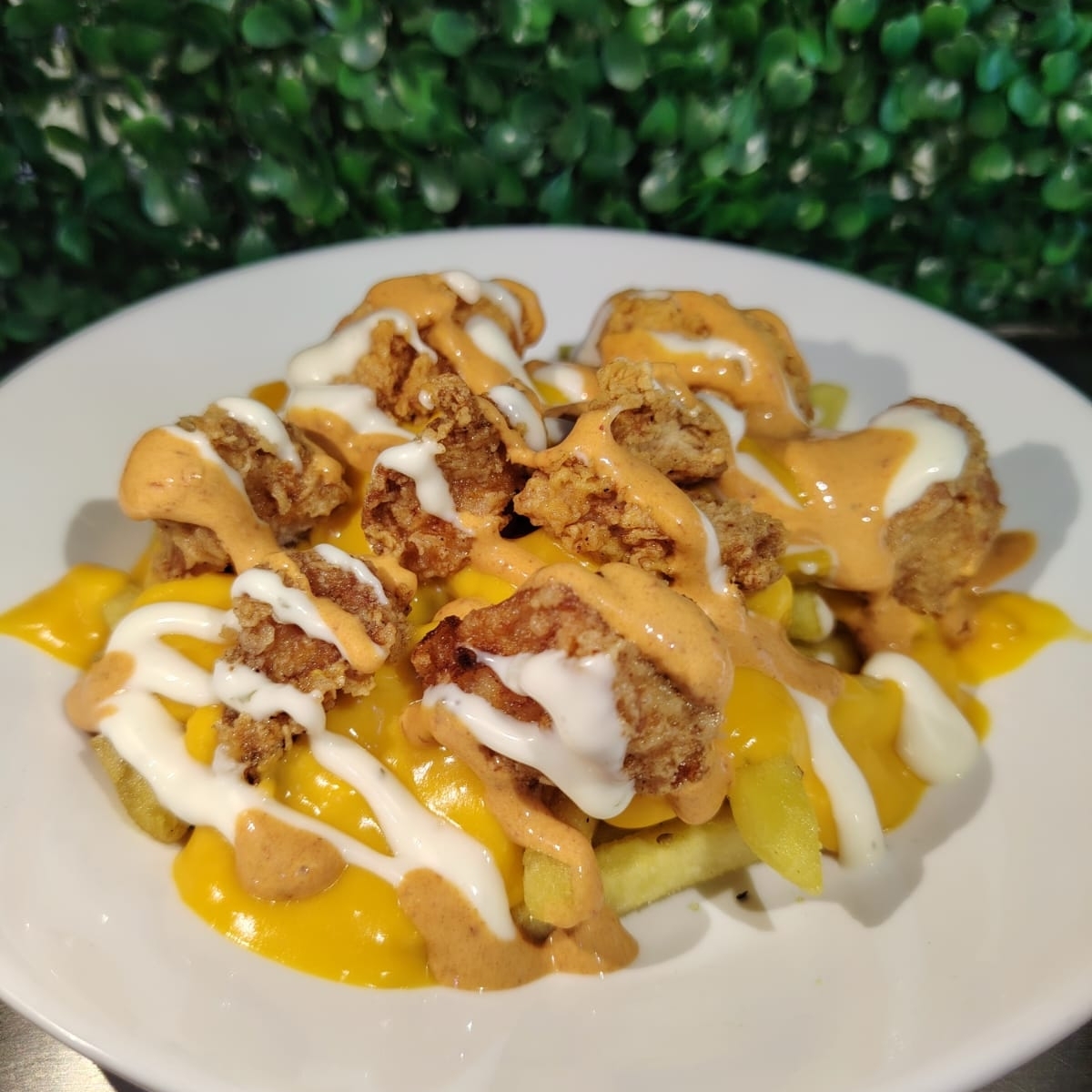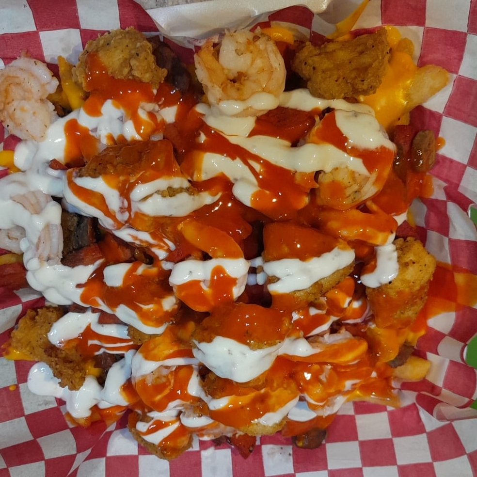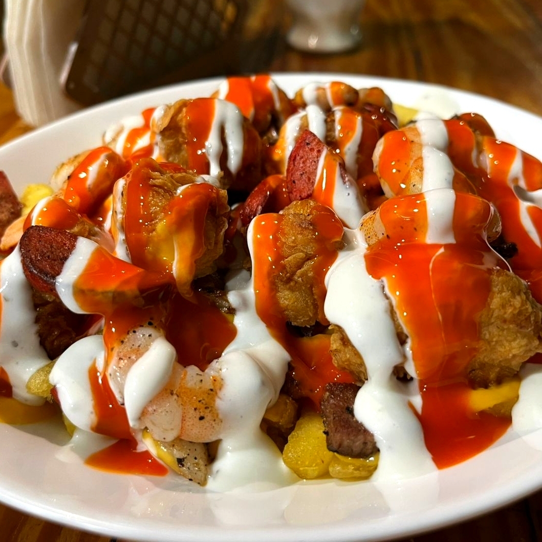 Papas francesas bañadas con queso amarillo con boneless, carne para asar, salchicha campestre y camarón acompañadas de ranch y salsa de tu elección.