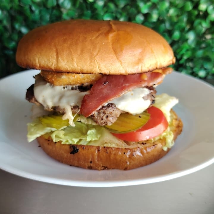 120 gr de jugosa carne de res sazonada. Con queso, lechuga, tomate, pepinillos aros de cebolla y tocineta en pan Brioche y aderezo de la casa.